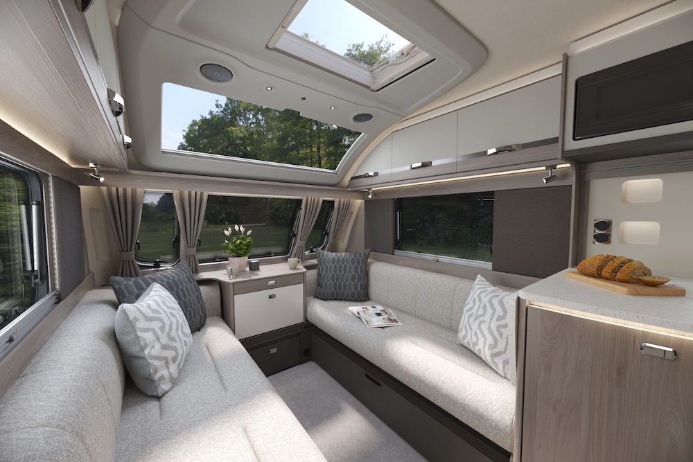 Modern touches set the Conqueror apart. Alde dual-fuel central heating provides efficient warmth all year round, while ambient lighting creates a welcoming evening atmosphere. Multiple USB points and connectivity options ensure tech convenience on the go, and the built-in solar panel supports sustainable touring. Overall, the specification makes the Conqueror a strong contender for those who want a high-end touring caravan without compromise.